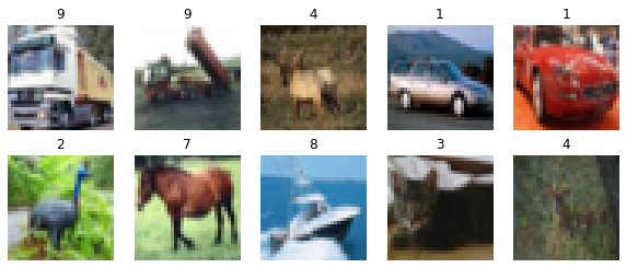 data,label = iter(train_loader).next() fig = plt.figure(figsize = (10,4)) for i in range(1,11): ax = fig.add_subplot(2,5,i) ax.axis("off") ax.set_title(label[i].numpy()) ax.imshow(data[i].permute(1,2,0))
